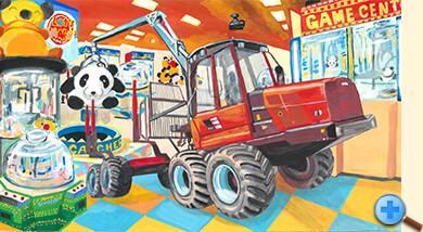 城下町には、黄色いフォワーダーがよく似合う!石垣、街並み、松の木に鷹の表現、ぬりえに至るまで、とても繊細に描かれています。和の心を感じます。