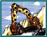 このえは、ショベルがほうせきをほっておおがたダンプにつんでるところだって。すごくいろがきれいなほうせきだね! |